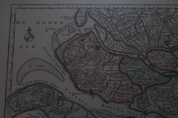 De kaart draagt sporen van een tijd waarin cartografie nog ambacht was. Ze is voorzien van de originele opdruk “Nieuwe Kaart van Voorne-Putten”, wat het stuk extra karakter en authenticiteit verleent.