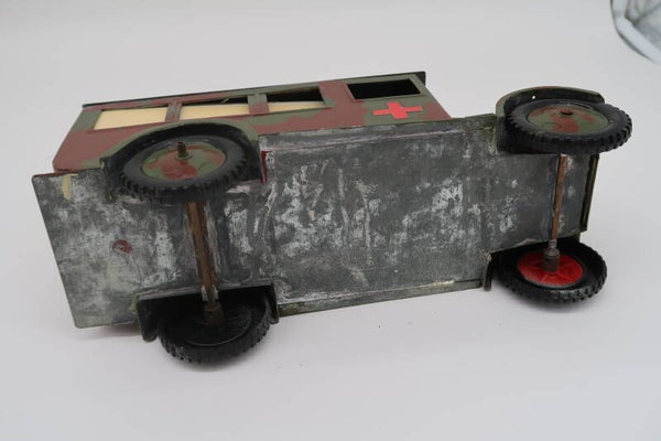 Zeer bijzonder en zeldzaam vintage speelgoed: een Hauser Duitse legerambulance van blik, uitgevoerd in camouflagekleuren met roodkruis-symbolen op de zijkanten. Dit stuk komt vermoedelijk uit de jaren ’30–’50 en is een fraai voorbeeld van vroeg 20e-eeuws militair speelgoed uit Duitsland.