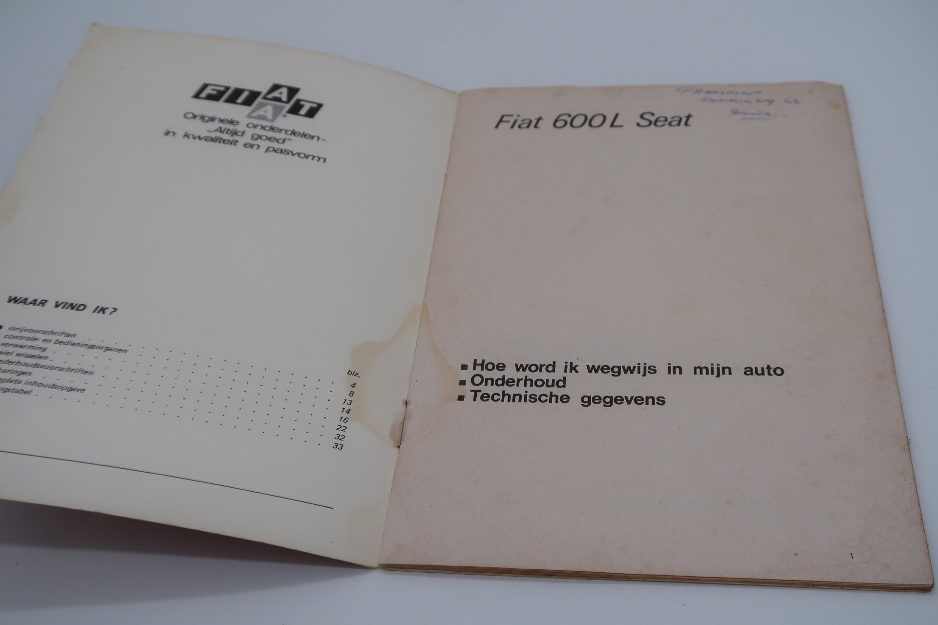 Origineel instructieboekje voor de Fiat 600 L en SEAT 600 L, met duidelijke uitleg over bediening, onderhoud en technische gegevens.