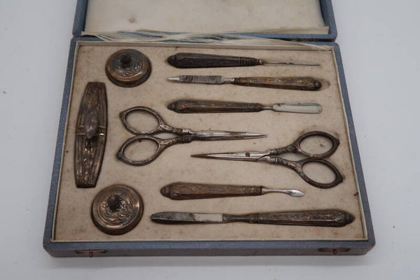 Deze elegante pedicureset uit de jaren 1920 is een prachtig voorbeeld van vakmanschap en stijl uit het begin van de 20e eeuw. De set bestaat uit diverse instrumenten in zilver, zorgvuldig vervaardigd en met een verfijnde afwerking.