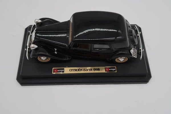 Prachtig gedetailleerd schaalmodel van de iconische Citroën 15 CV Traction Avant uit 1938, vervaardigd door Burago. Dit model weerspiegelt het baanbrekende ontwerp waarmee Citroën in de jaren ’30 zijn tijd ver vooruit was, met voorwielaandrijving en een lage, gestroomlijnde carrosserie.